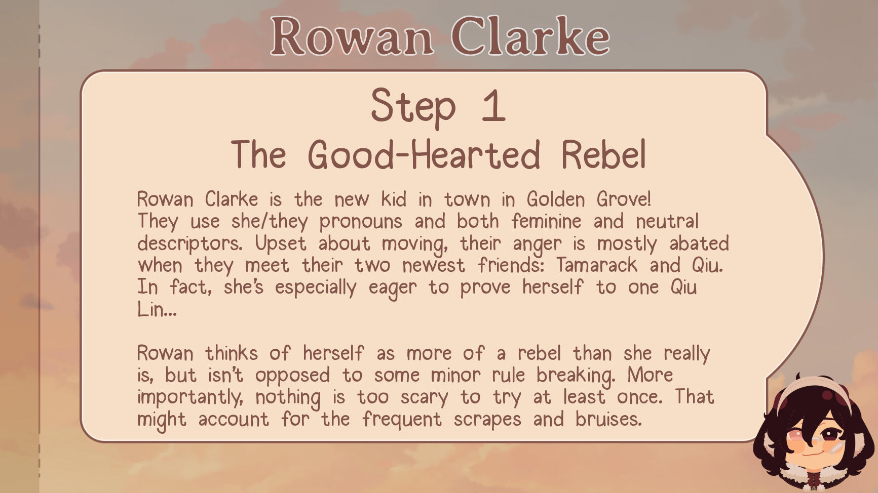 Rowan knows they are nonbinary from a young age. Intentional misgendering at any age will not be tolerated.Because the game is still in production, any and everything here is subject to change. This may include Rowan's appearance at older ages, aspects of their personality at any age, and general assumptions about their life past the prologue.